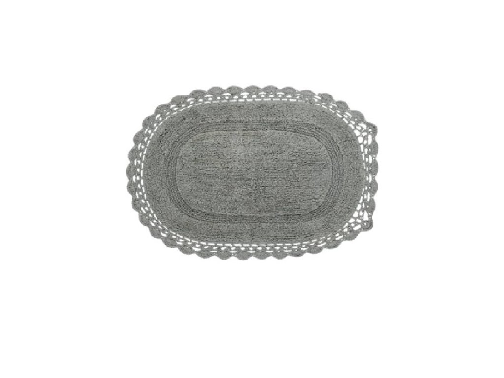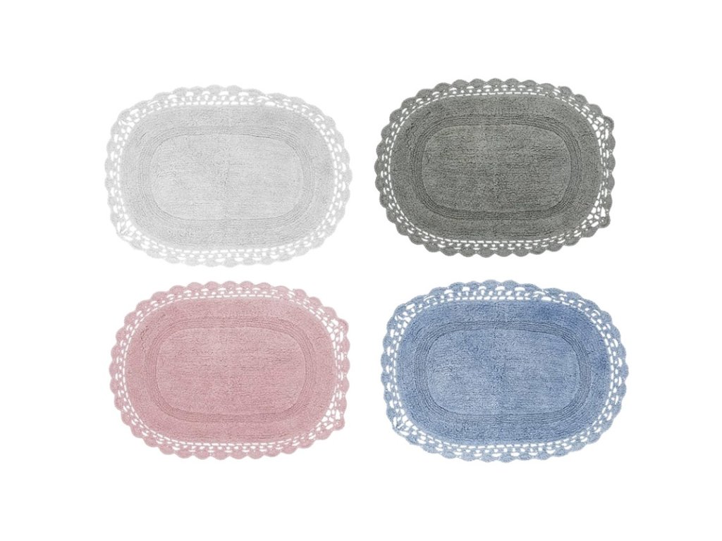 Elegantná a romantická kúpeľňová oválna rohož z bavlny, ktorá má po obvode krajku.