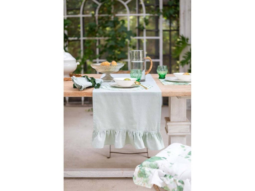 Bavlnený behúň na stôl s volánikom 10cm. Pranie v práčke na 30C. Originál z dielne Blanc Mariclo.