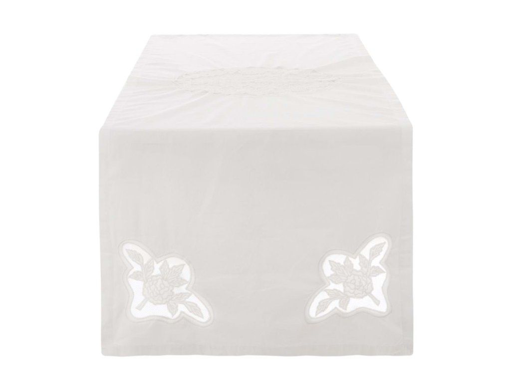 rozmer: 50 × 150 cm • materiál: 100 % bavlna • farba: biela / ivory • vlastnosti: výšivka • štýl: elegantný / romantický / vintage • použitie: interiér – stolový behúň • výrobca: Blanc Mariclò