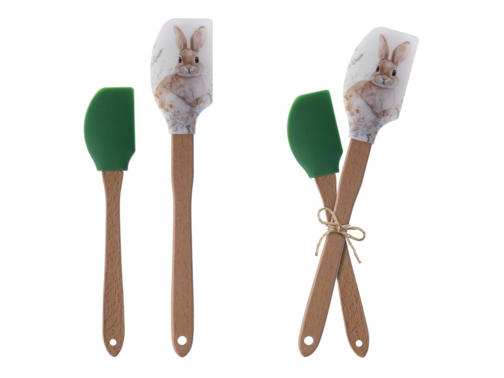 rozmery: 5 × 1 × 31 cm • materiál: silikón, drevo • kolekcia: Vichy • farba: zelená, biela • motív: zajačik • štýl: veľkonočný / vidiecky • použitie: kuchynské stierky • balenie: sada 2 ks