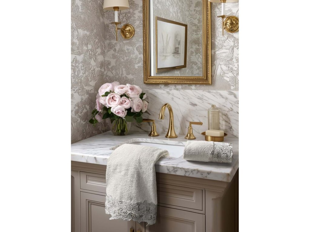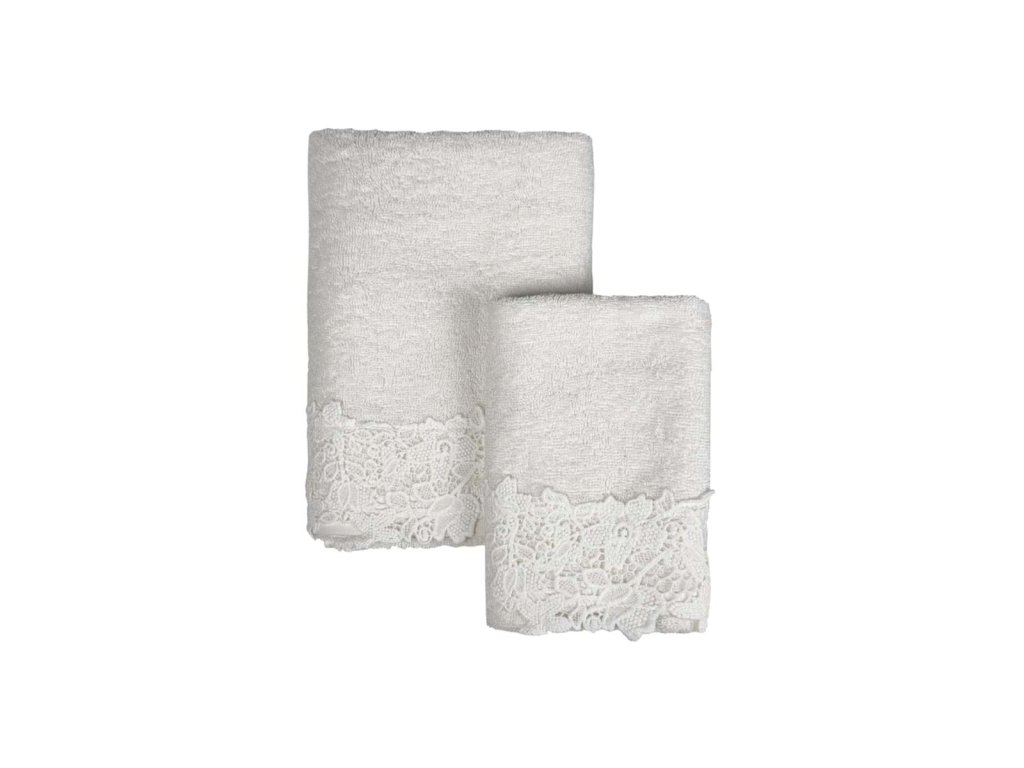 Romantický set dvoch bavlnených froté uterákov v jemnej krémovo bielej farbe s dekoratívnou čipkou je ideálny do štýlovej kúpeľne. Vyrobený z kvalitného materiálu, ktorý je mäkký, savý a vhodný na pranie v práčke. Dizajn od značky Blanc Mariclò spája praktickosť s talianskou eleganciou.
