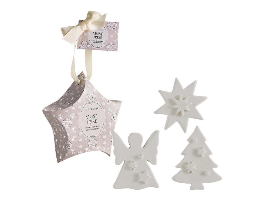 6 sadrových dekorácií (2 jedle, 2 anjeli a 2 hviezdy), vôňu dúhového pižma.