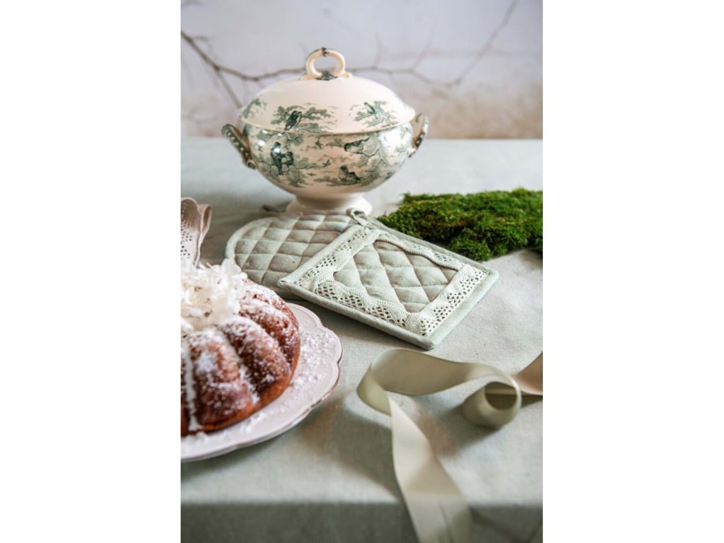 Zelený set 2 chňapiek s čipkou – okrúhla 20 cm a štvorcová 16 × 16 cm, kolekcia New Infinity, Blanc MariClo’.