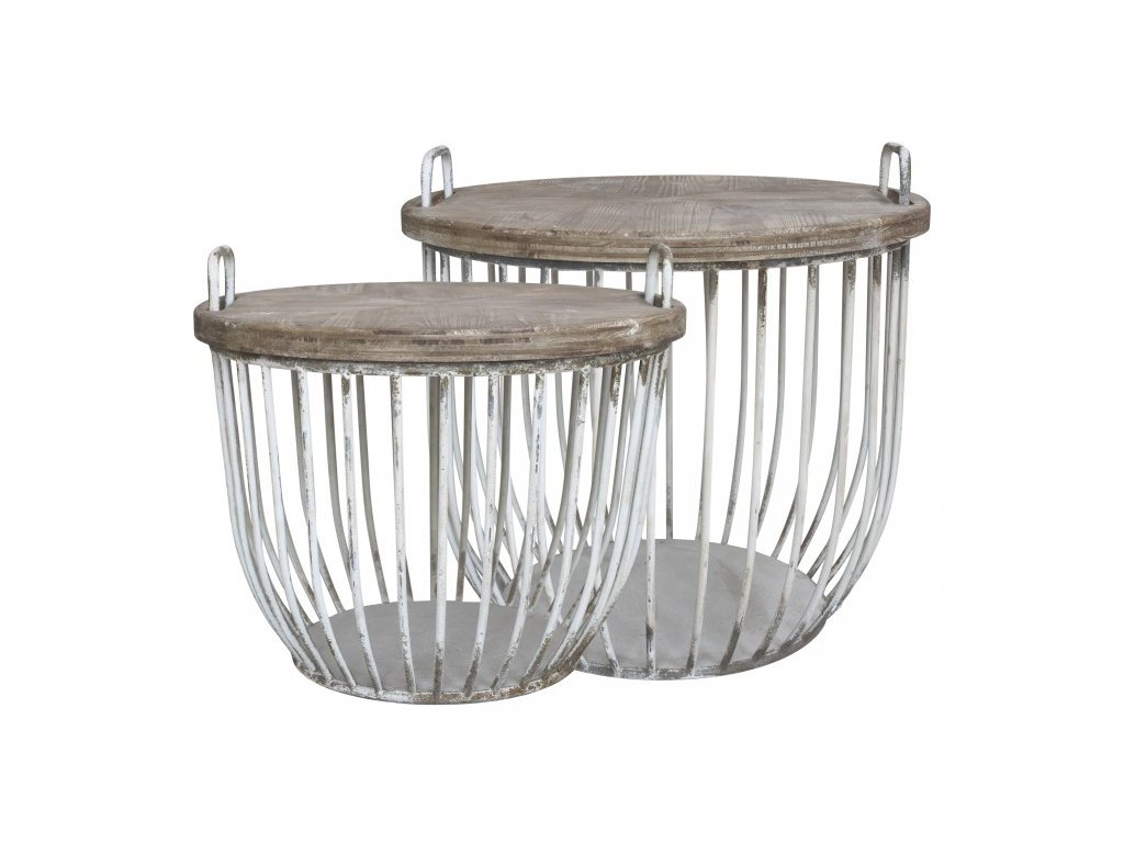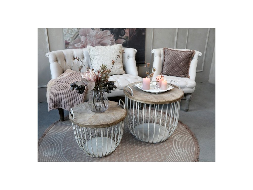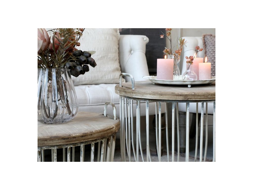 Unikátny set dvoch konferenčných stolíkov s bielou patinou. Vrchná doska je odnímateľná. Stolíky sú z recyklovaného dreva a ich výzor je jedinečný. Menší stolík má výšku 38cm, d49cm. Cena za set. Originál z dielne Chic Antique.