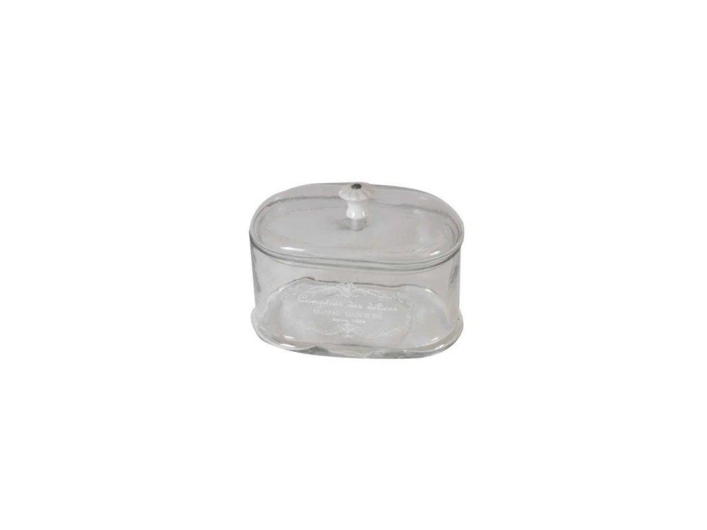 Sklenená dózu s viečkom, originálny, jedinečný a romantický vzhľad. Je zdobená jemným nápisom "Comptoir des ateliers". Krásny a praktický doplnok do kuchyne alebo jedálne, ktorý dodáva priestoru šarm a eleganciu.