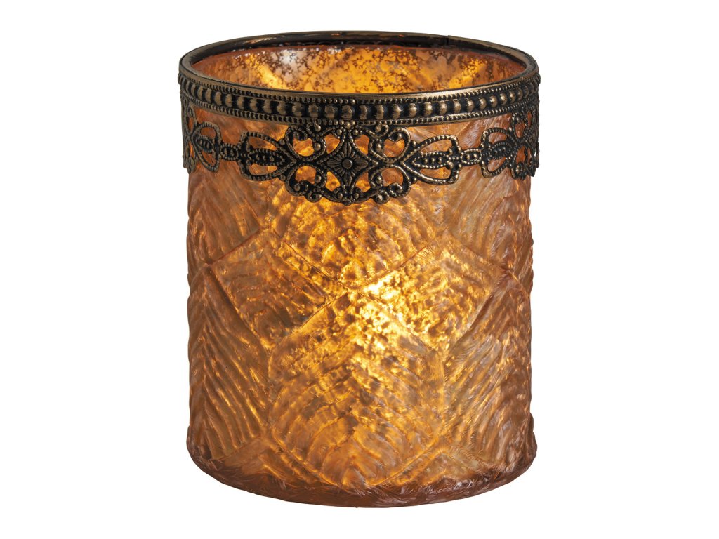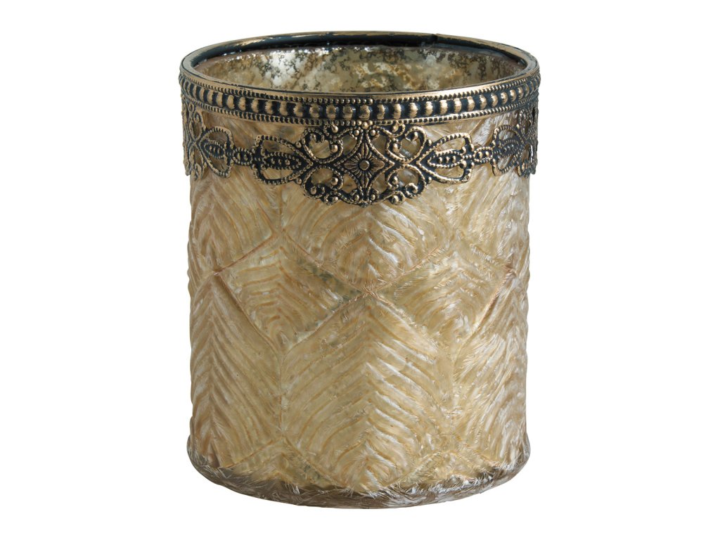 Sklenený svietnik z matného žltého skla s kovovým okrajom. Tento svetlý svietnik na čajovú sviečku do vázy Jardin d'Hiver plný elegancie a detailov, malý model, vnesie do vašej dekorácie nádych originality.