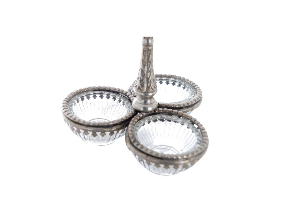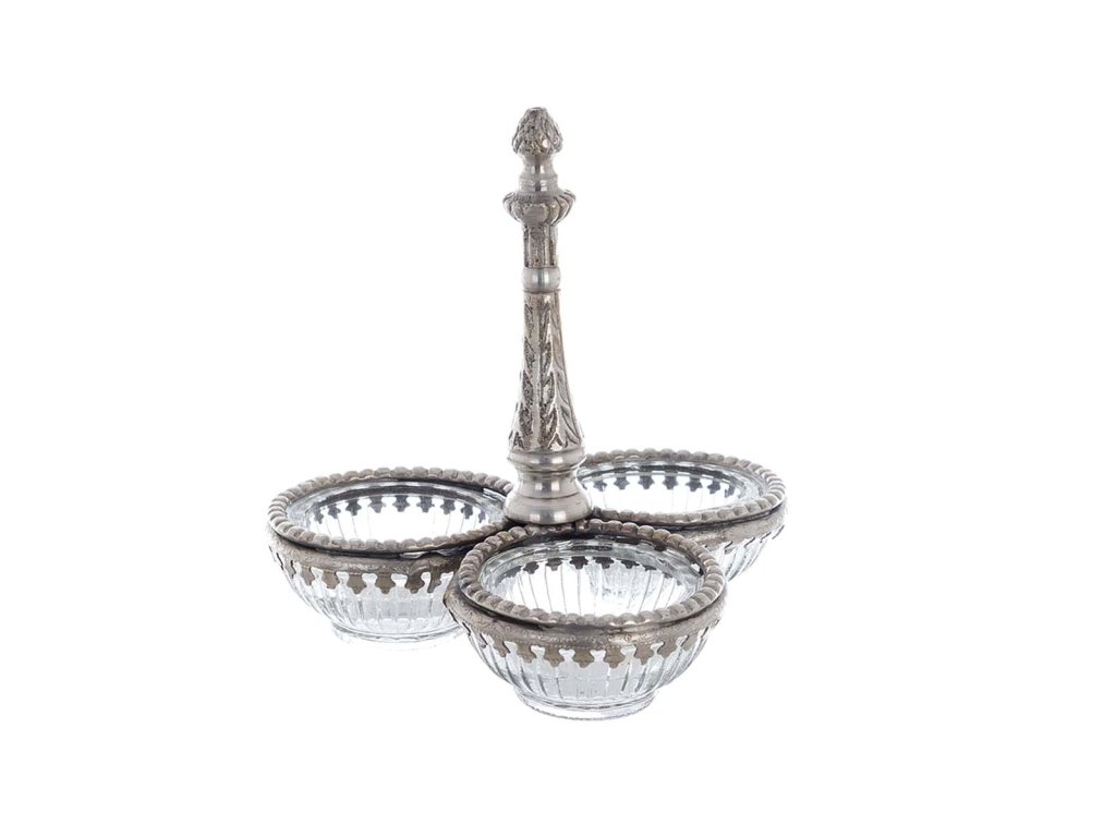 Jedinečný kovový strieborný stojan s nádobkami (na soľ, korenie) so sklom ako originálny interiérový doplnok, ktorý navodí tú správnu slávnostnú atmosféru. Originál z dielne Blanc Mariclo.
