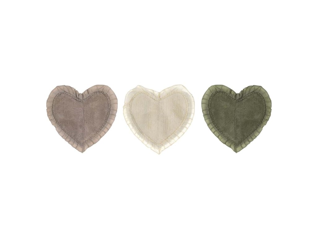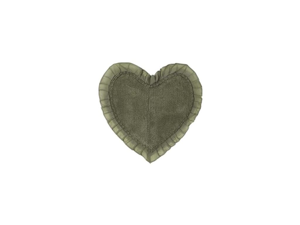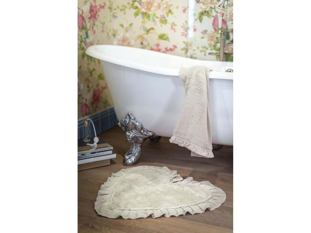 Elegantná a romantická kúpeľňová srdcová rohož z bavlny, ktorá má po obvode volán.