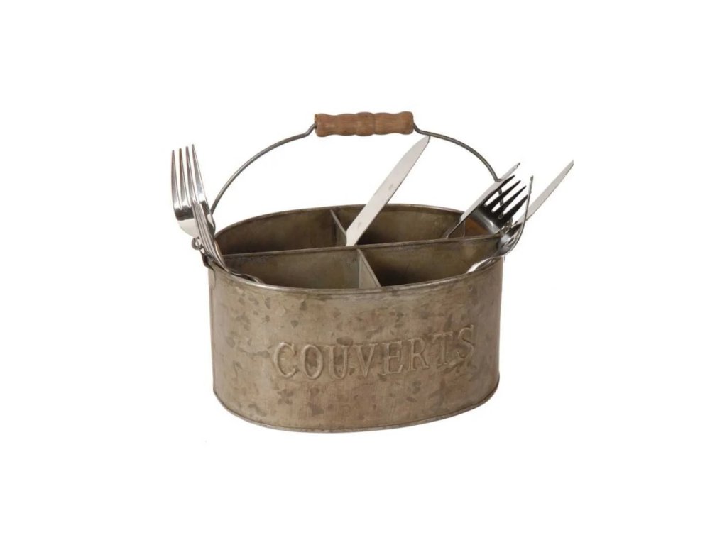 V srdci vašej kuchyne zažiari tento očarujúci zinkový stojan na príbory s nápisom 'COUVERTS'. Jeho patina rozpráva príbehy nespočetných spoločných jedál, kým rustikálna drevená rúčka vás pozýva na dokonalú organizáciu stolovania s nádychom provence. Malé umelecké dielo pre váš každodenný život.