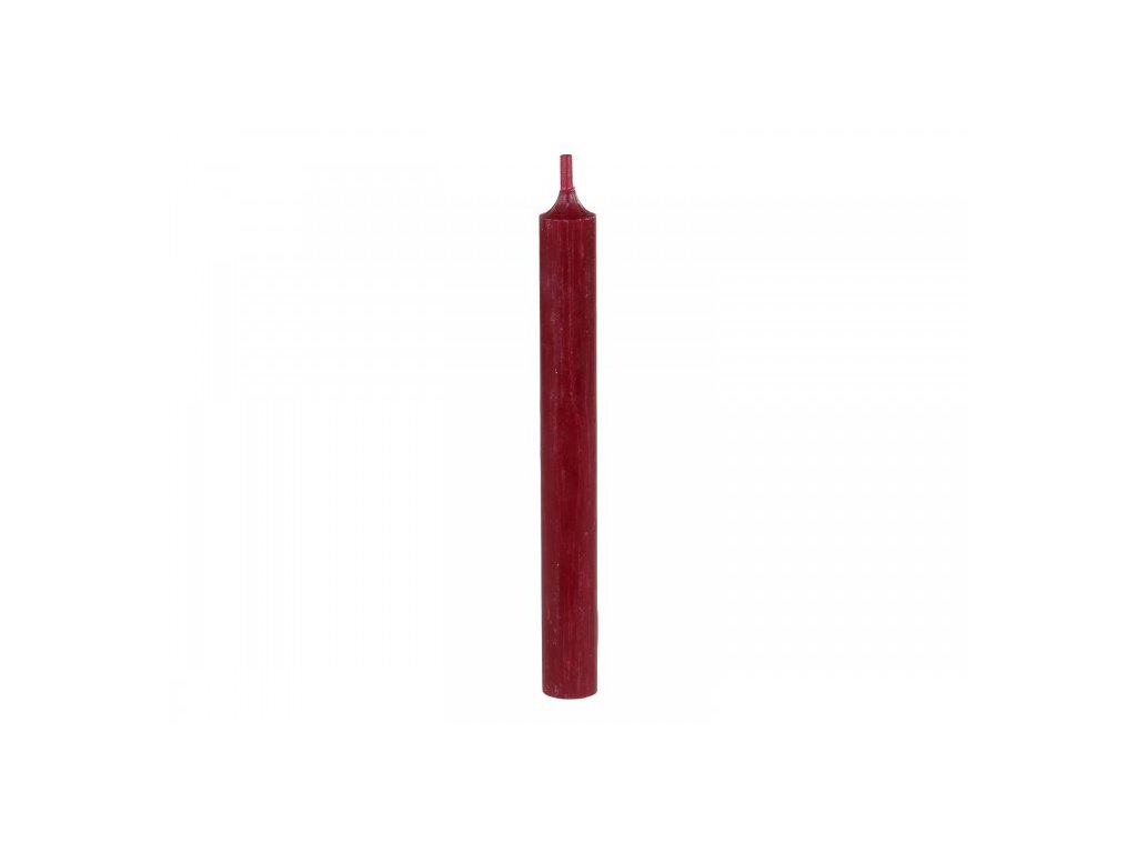 Červená bordová vysoká sviečka z parafínu v štýle rustic. Doba horenia 7 hodín. Nesteká.