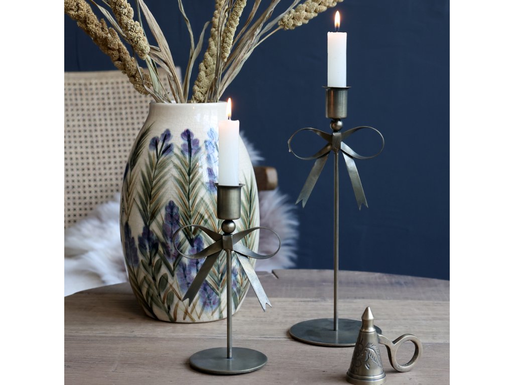 Elegantný svietnik od značky Chic Antique je dokonalým doplnkom do vintage či rustikálne ladeného interiéru. Vyrobený z kvalitného kovu a zdobený jemnou mašľou, pôsobí romanticky a zároveň štýlovo. Odtieň antique brass (patinovaná mosadz) dodáva svietniku historický nádych. Rozmery výška 18 cm / dĺžka 10,5 cm / šírka 7,5 cm ho predurčujú na dekoráciu stola, komody alebo parapetu.