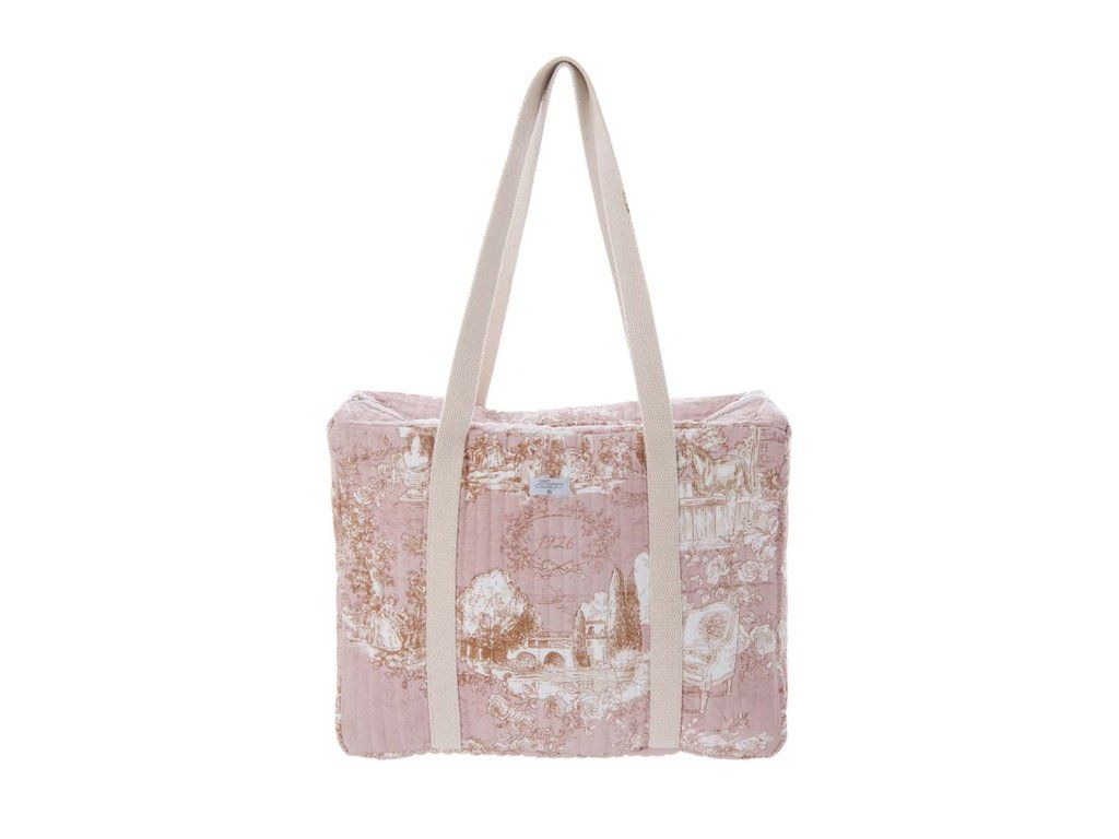 rozmer: 40 × 30 × 15 cm • materiál: 100 % bavlna • farba: ružová • vlastnosti: zapínanie na zips, rúčky na rameno • štýl: romantický / vintage / francúzsky • použitie: interiér / exteriér – dámska taška • výrobca: Blanc Mariclò