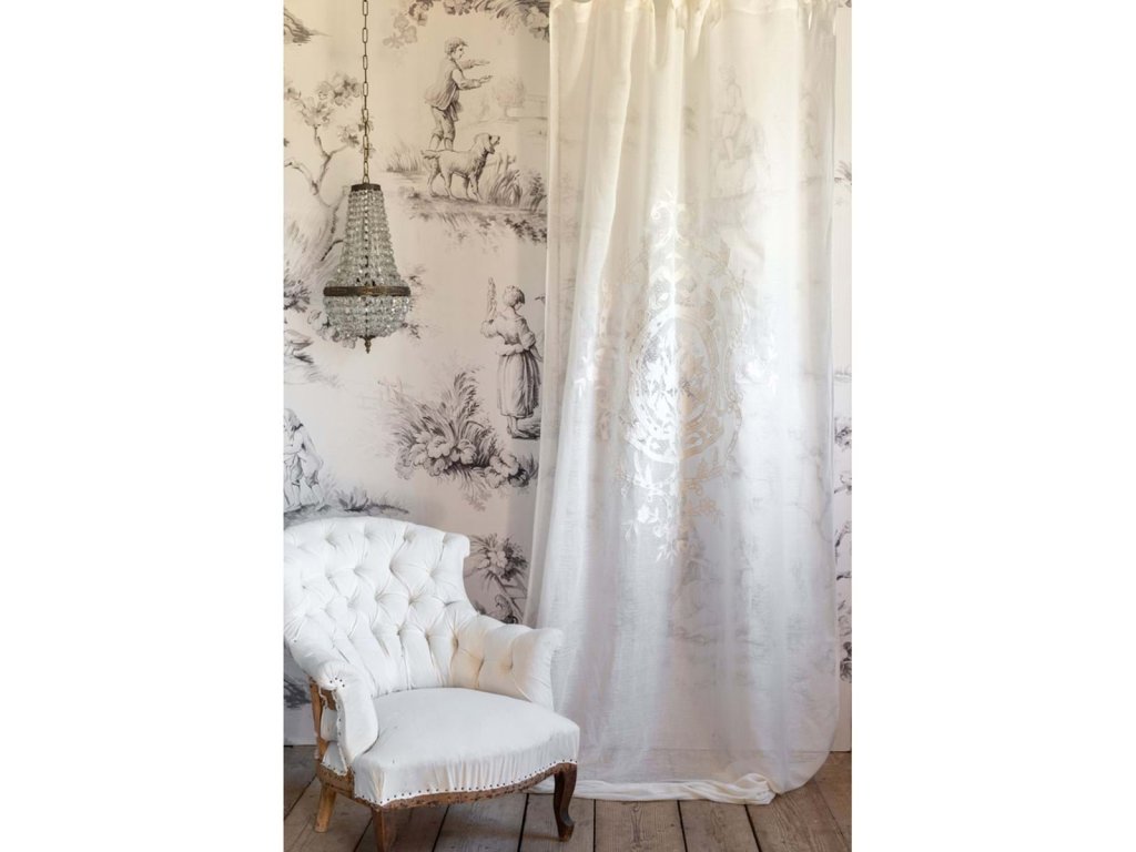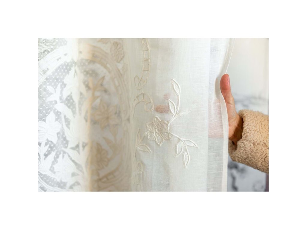Romantický záves (1 pás) s úchytmi z látky. S vyšívanou stredovou rozetou. Pranie v práčke. Cena za kus. Originálny výrobok z toskánskej dielne Blanc Maricló.