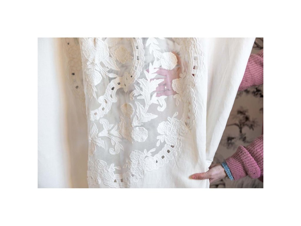 Romantický záves (1 pás) s úchytmi z látky. S vyšívanou stredovou rozetou. Pranie v práčke. Cena za kus. Originálny výrobok z toskánskej dielne Blanc Maricló.