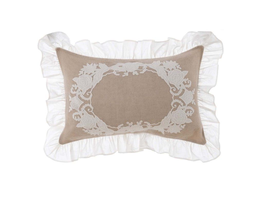 rozmer: 45 × 60 cm • materiál: 50 % bavlna, 50 % ľan • farba: béžová / biela výšivka • vlastnosti: aplikácia, biely volán, s výplňou • štýl: vintage / romantický / vidiecky • použitie: interiér – dekoračný vankúš • výrobca: Blanc Mariclò