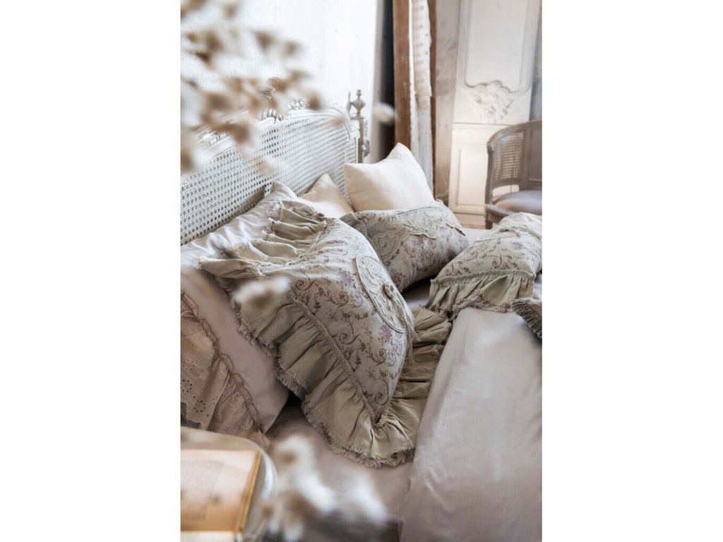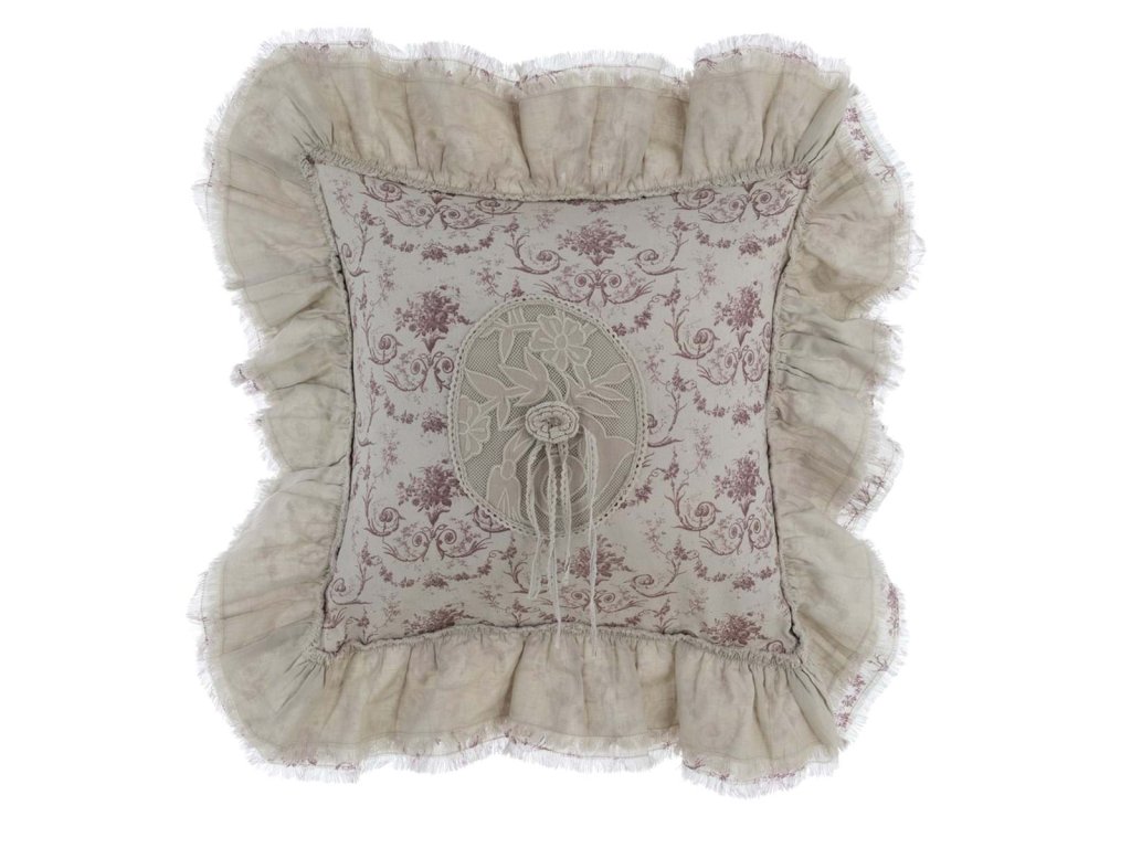 Elegantný a romantický vankúš s volánikom a výšivkou v béžobordovej farbe od toskánskeho výrobcu Blanc Mariclò.