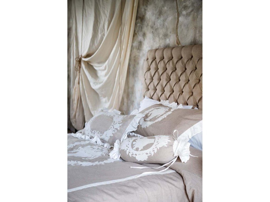 rozmer: 30 × 50 cm • materiál: 50 % ľan, 50 % bavlna • farba: béžová / biela výšivka • vlastnosti: valcový tvar, s výplňou • štýl: vintage / romantický / vidiecky • použitie: interiér – dekoračný vankúš • výrobca: Blanc Mariclò