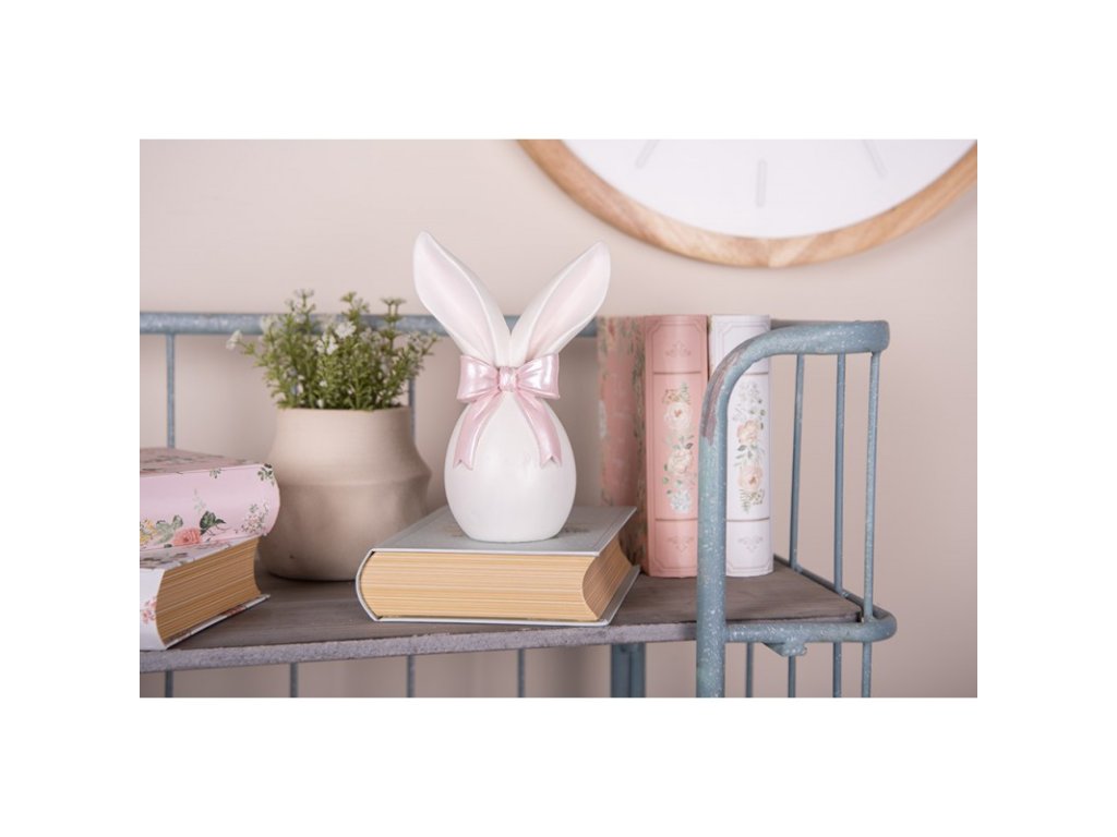 Roztomilá dekoratívna figúrka zajačika v jemnej bielo-ružovej kombinácii je ideálnym doplnkom pre všetkých milovníkov zajačikov a romantických dekorácií. Vďaka svojmu milému výrazu a výrazným uškám pôsobí nežne a hravo a okamžite si získa pozornosť.