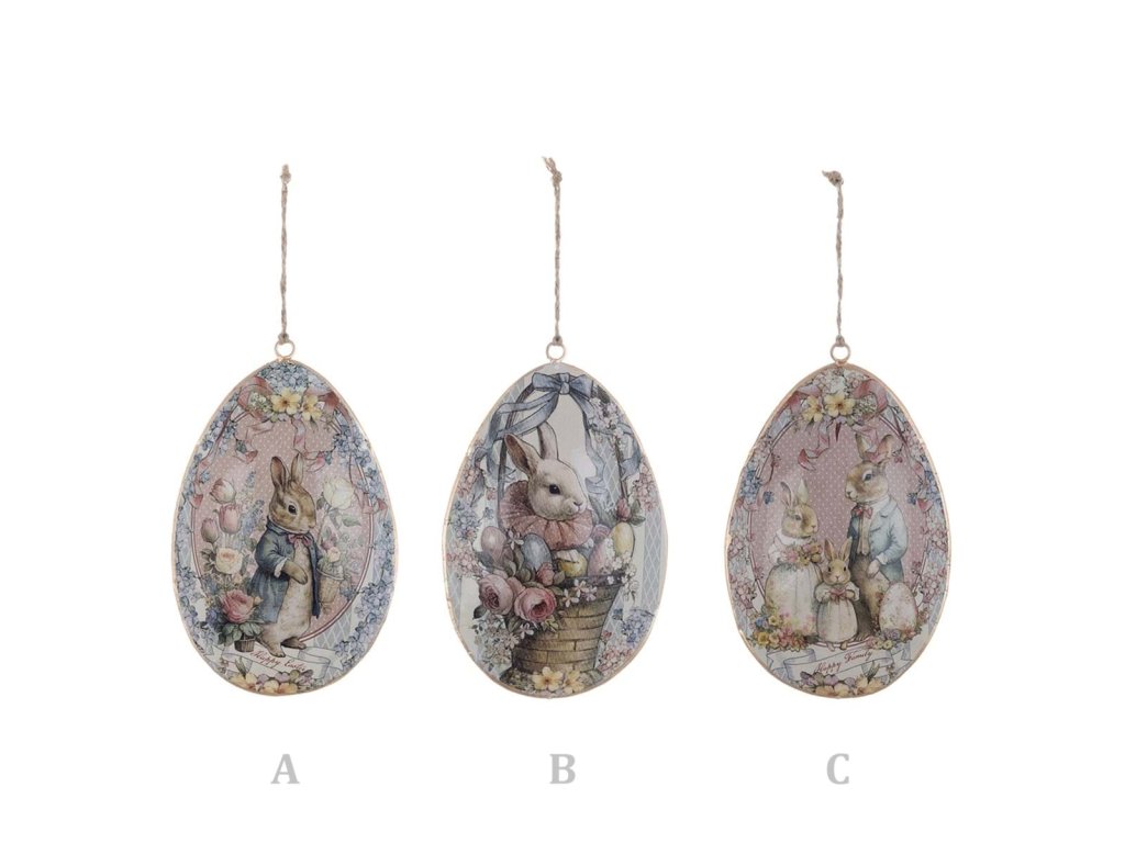 Kovové veľkonočné vajíčko zobrazuje králika v modrom kabáte, stojaceho medzi kvetmi a držiaceho veľkonočné vajíčko. Zdobené roztomilým chicky retro štýlom s lesklým povrchom. Originál z dielne Blanc Mariclo.