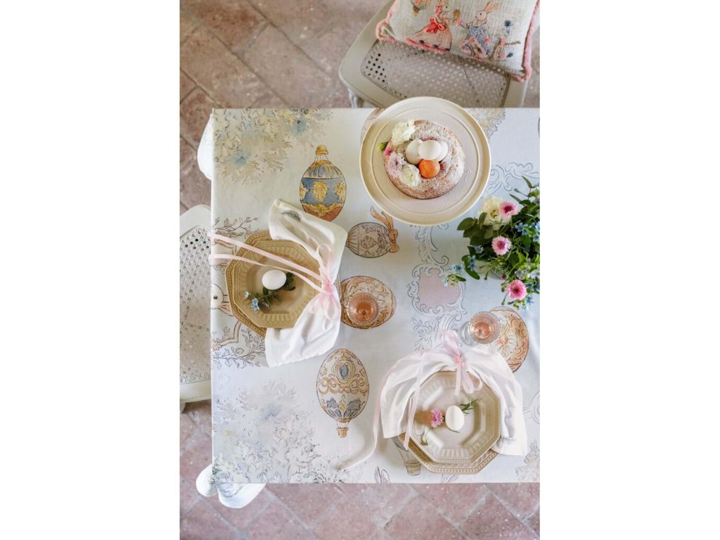 Elegantný bavlnený obrus z autorskej kolekcie Rococo je výnimočným kúskom veľkonočného aj romantického stolovania. Jemný motív romantických zajačikov a ornamentov v pastelových odtieňoch ružovej a modrej na bielom podklade pôsobí nežne, poeticky a sviatočne.