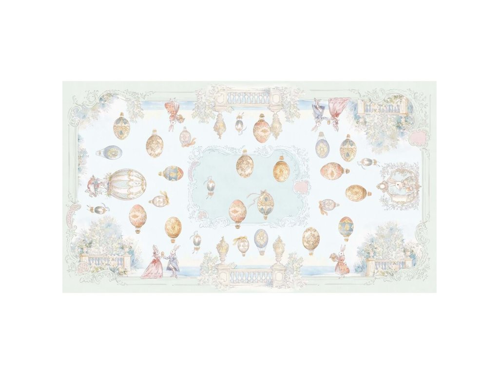 rozmery: 160 × 290 cm • materiál: 100 % bavlna • kolekcia: Rococo • motív: zajačiky, ornamenty • farba: biely podklad, pastelová ružová a modrá • štýl: veľkonočný / romantický / vintage • použitie: obrus