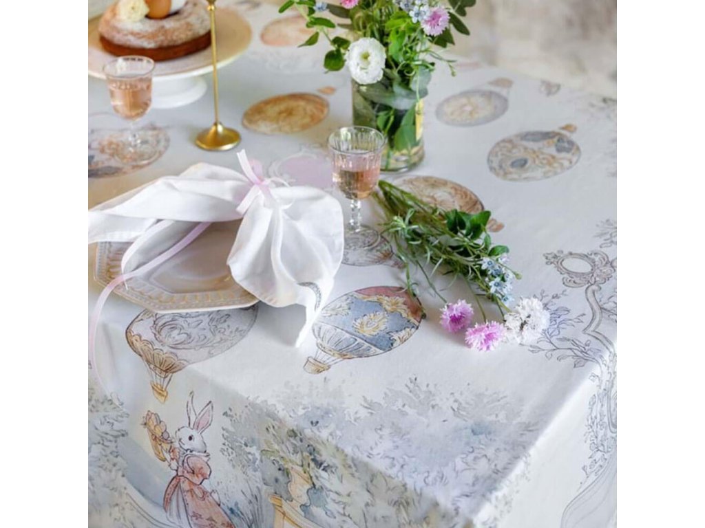 Elegantný bavlnený obrus z autorskej kolekcie Rococo je výnimočným kúskom veľkonočného aj romantického stolovania. Jemný motív romantických zajačikov a ornamentov v pastelových odtieňoch ružovej a modrej na bielom podklade pôsobí nežne, poeticky a sviatočne.