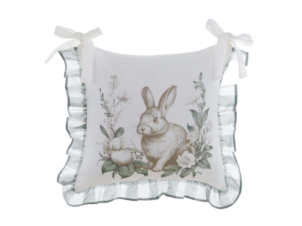 Veľkonočný textil v romantickom a vintage francúzskom štýle od značky Blanc Maricló. Tento provensálsky vankúš má detailnú ilustráciu králika obklopeného rôznymi kvetmi a lístím. Vankúš má riasený okraj s kockovaným vzorom a je zviazaný bielymi stužkami na horných rohoch, čo mu dodáva šarm a eleganciu typickú pre francúzsky vidiek.