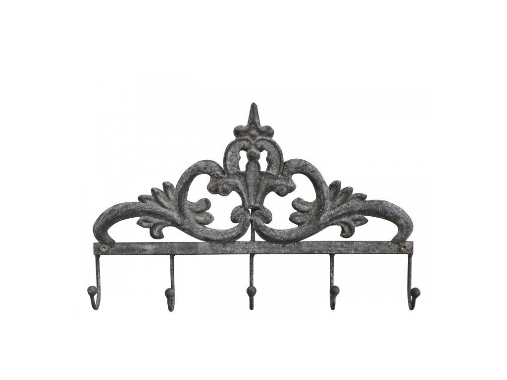 Kovový nástenný vešiak s 5 hákmi v sivom prevedení s patinou.