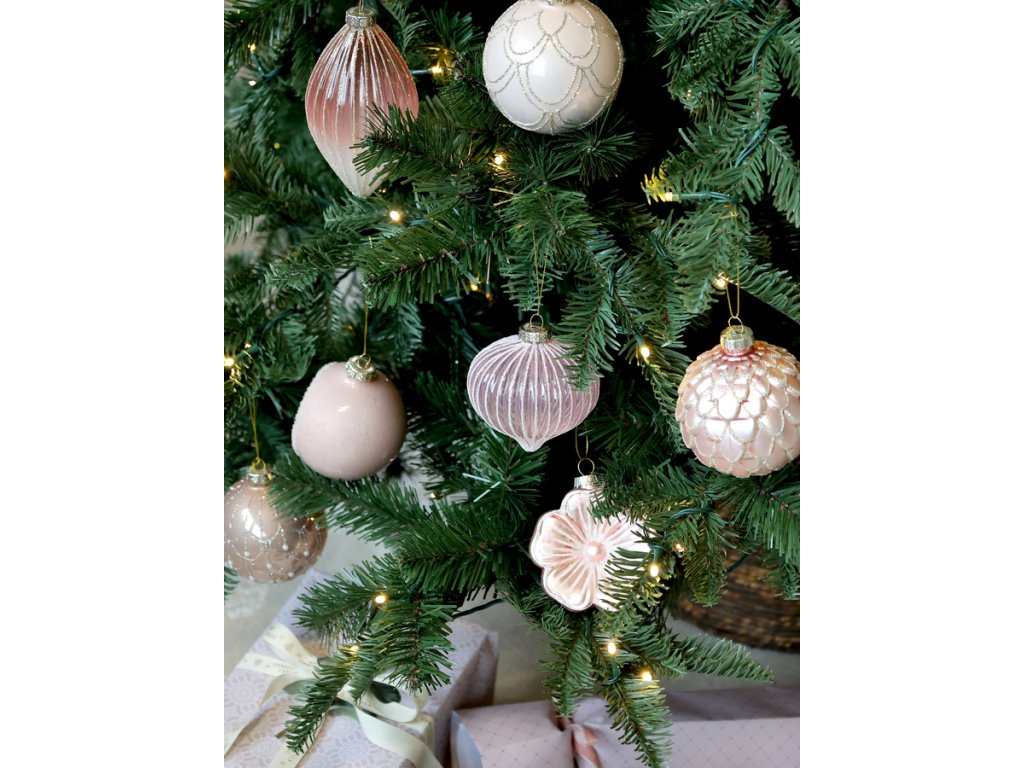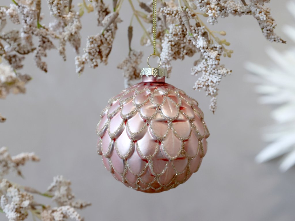 Dodajte svojmu vianočnému stromčeku nádych elegancie s pôvabnou vianočnou ozdobou od značky Chic Antique. Táto luxusná sklenená guľa v jemnom ružovom odtieni je ručne maľovaná, čo z nej robí jedinečný dekoratívny kúsok plný detailov a remeselného umenia.