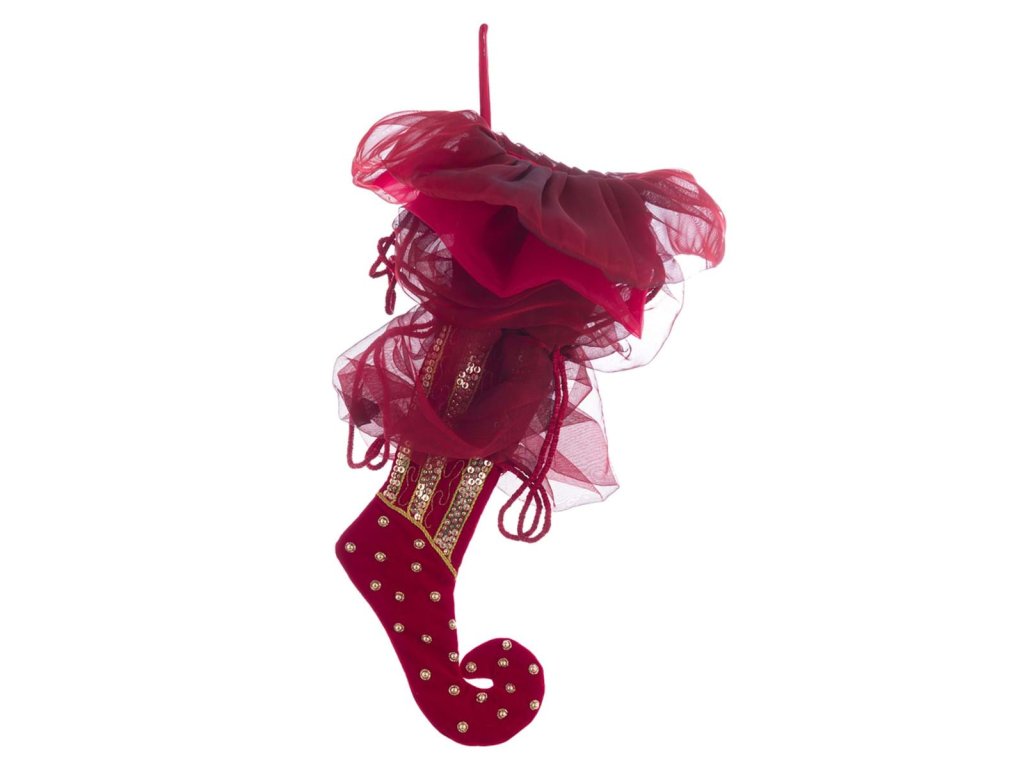 ✅ Vianočná ponožka na dekoráciu ✅ Červená so zlatými detailmi – goráliky a perličky ✅ Rozmer: 56 cm – výrazný doplnok ✅ 100 % polyester – odolný materiál ✅ Kolekcia Cantus Natalis – Blanc Mariclo
