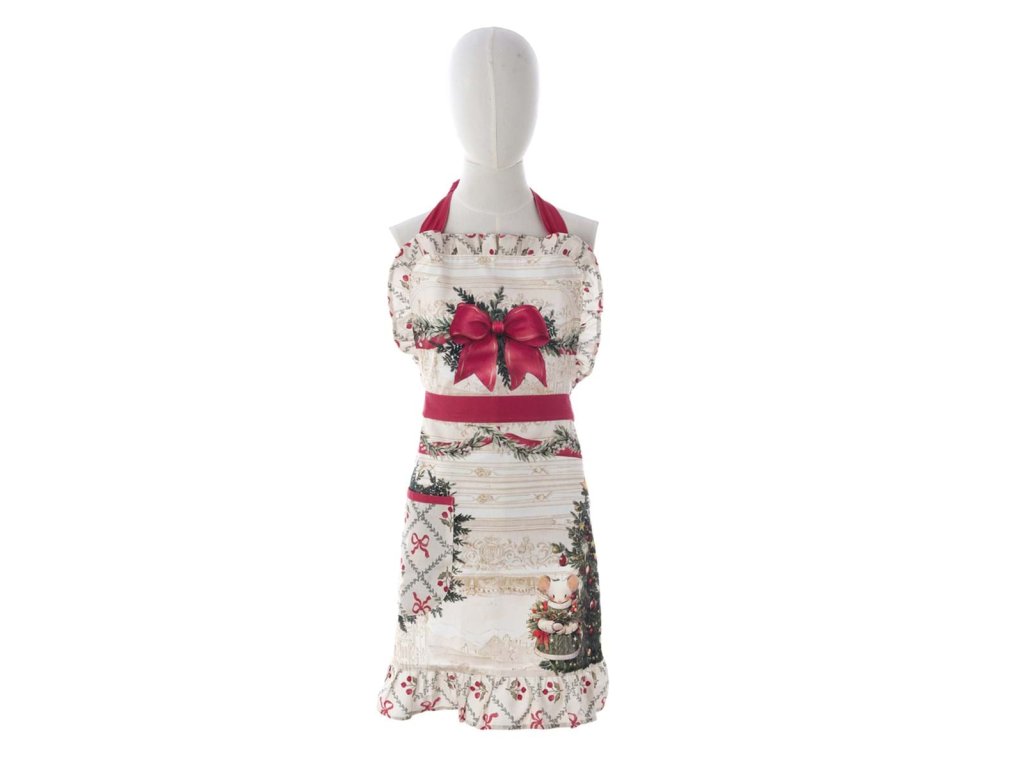 Romantická vianočná zástera na zaviazanie od talianskej značky Blanc Maricló z kolekcie Noel Famille je ideálnym doplnkom do sviatočnej kuchyne. Vyrobená zo 100% bavlny, zdobená rozkošným motívom maľovaných vianočných myšiek v tradičných farbách – zelená, červená a biela. Praktické vrecko a dekoratívny volán dodávajú zástere štýlový vzhľad s nádychom vintage elegancie. Originálny výrobok z toskánskej dielne Blanc Maricló.