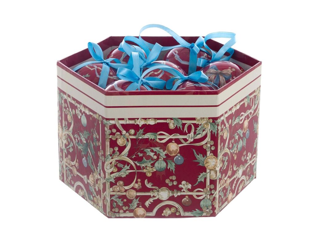 Elegantná darčeková krabička s 14 vianočnými dekoráciami od talianskej značky Blanc Maricló z kolekcie Intrecci di Sogno je ideálnym doplnkom na sviatočné zdobenie interiéru alebo ako štýlový darček. Dekorácie s priemerom 7,5 cm sú vyrobené z ľahkého lesklého plastu a zdobené motívmi ornamentov, ozdôb a mašličiek v romantickom vintage štýle. Krabička v červenej farbe s modrou mašľou pôsobí slávnostne a elegantne. Tento originálny výrobok z toskánskej dielne je navrhnutý s dôrazom na detail, estetiku a taliansky šarm.