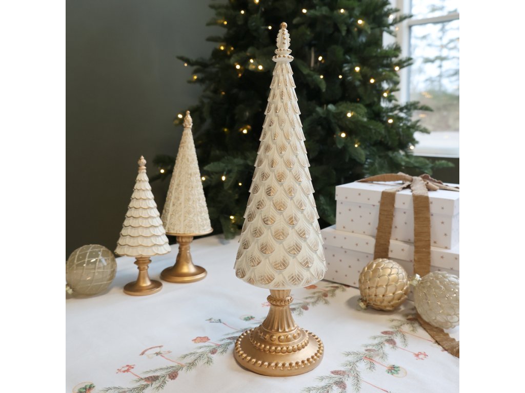 Elegantný vianočný stromček Noël od značky Chic Antique je štýlovou dekoráciou, ktorá dodá vášmu interiéru sviatočný lesk a vintage šarm. Vyrobený z kvalitného polyrezínu, má povrchovú úpravu v odtieni antique cream – jemná kombinácia zlatej a bielej farby, ktorá pôsobí luxusne a nadčasovo.