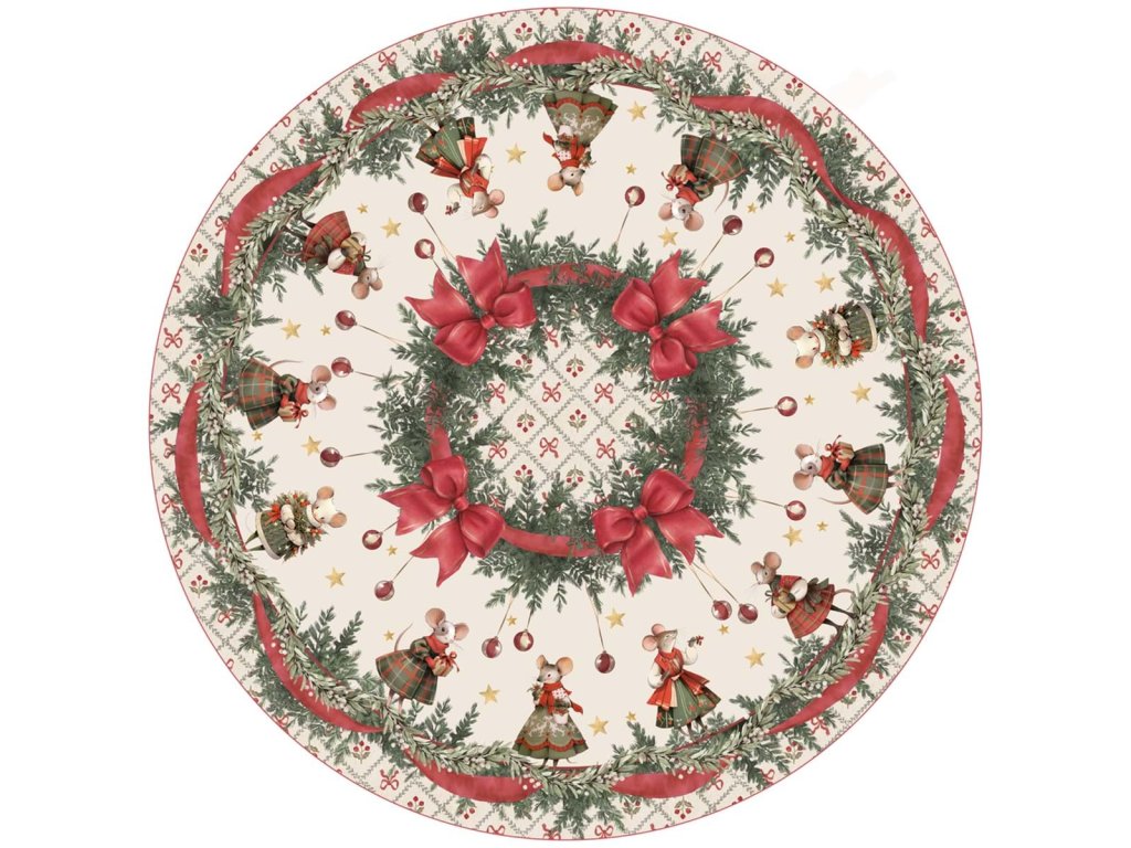 Elegantný okrúhly vianočný koberec od talianskej značky Blanc Maricló z kolekcie Noel Famille je štýlovým doplnkom, ktorý dodá vášmu interiéru sviatočnú atmosféru. Vyrobený zo 100% bavlny, s priemerom Ø 154 cm, zdobený rozprávkovým motívom maľovaných vianočných myšiek a mašličiek v tradičných farbách – zelená, červená a biela. Originálny dizajn z toskánskej dielne Blanc Maricló spája kvalitu, pohodlie a taliansku eleganciu.