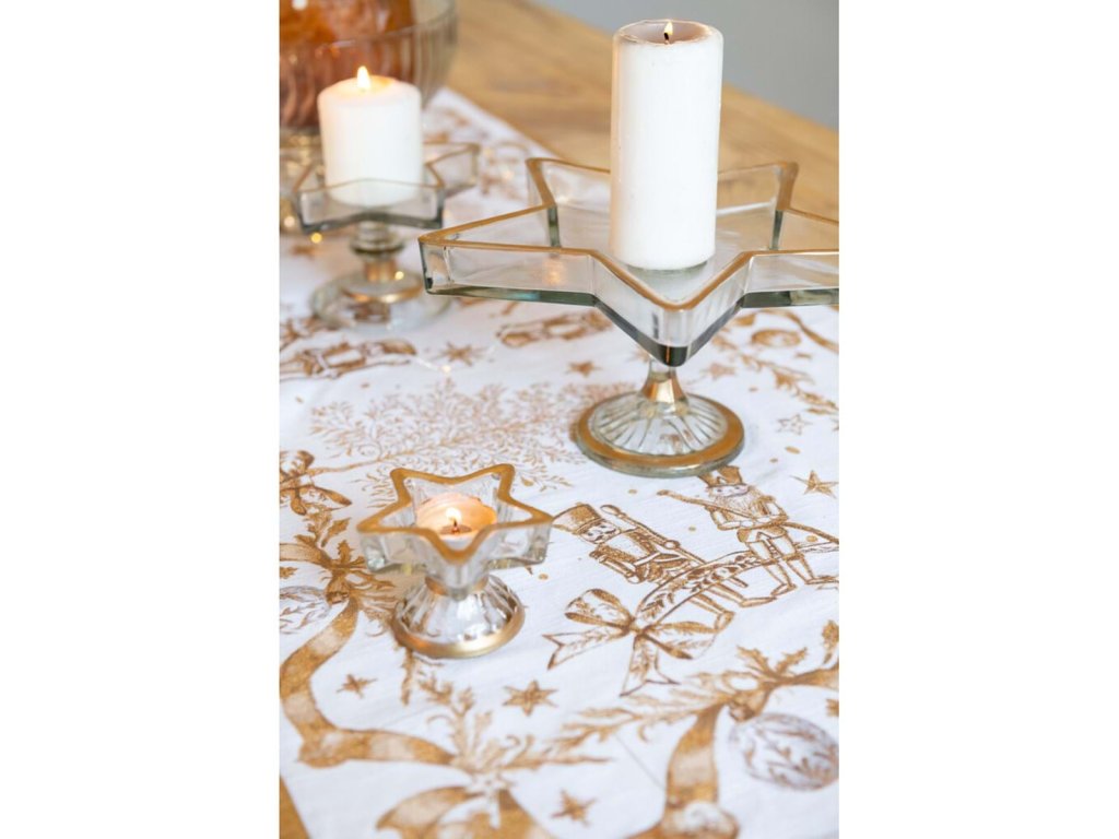 Luxusný vianočný obrus od talianskej značky Blanc Mariclo s rozmermi 160 × 340 cm je vyrobený zo 100 % bavlny a zdobený elegantným motívom Luskáčika, vojačikov a vianočných gúľ. V zlatobielej farebnej kombinácii pôsobí slávnostne, štýlovo a dokonale doplní váš sviatočný stôl.