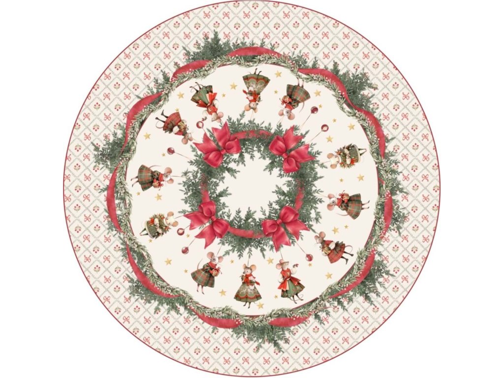 Štýlový vianočný obrus od talianskej značky Blanc Maricló z kolekcie Noel Famille je nosným prvkom tohtoročnej sviatočnej výzdoby. Vyrobený zo 100% bavlny, zdobený originálnym motívom maľovaných vianočných myšiek v tradičných farbách – zelená, červená a biela. Okrúhly tvar s priemerom ø 160 cm je ideálny na sviatočný stôl v kuchyni či jedálni.