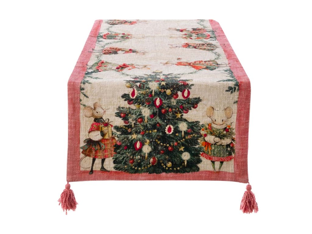 Štýlový vianočný runner so strapcami od talianskej značky Blanc Maricló z kolekcie Noel Famille je nosným textilným doplnkom tejto sviatočnej sezóny. Vyrobený zo 100% bavlny, zdobený originálnym motívom maľovaných vianočných myšiek v tradičných farbách – zelená, červená a biela. Vhodný na stôl, komodu či konferenčný stolík.