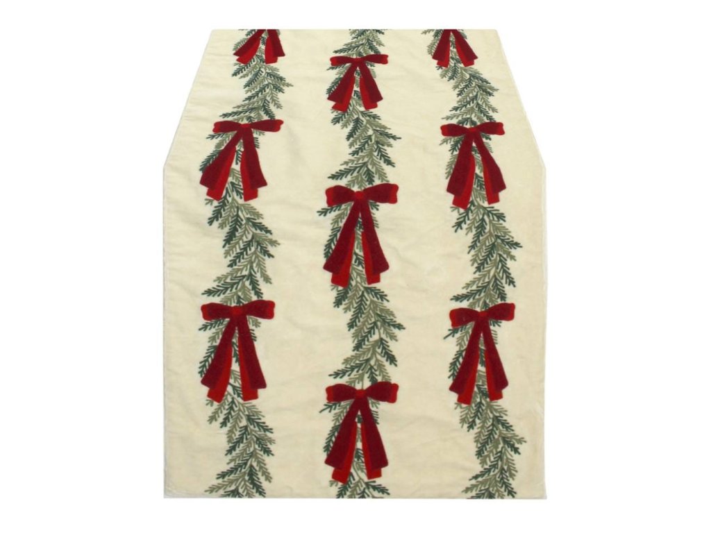 Elegantný vianočný zamatový runner od značky Blanc Maricló z Toskánska. Vyrobený z 100% bavlny. Smotanový podklad zdobí aplikácia mašličiek a vetvičiek – ideálny na sviatočné doladenie interiéru.