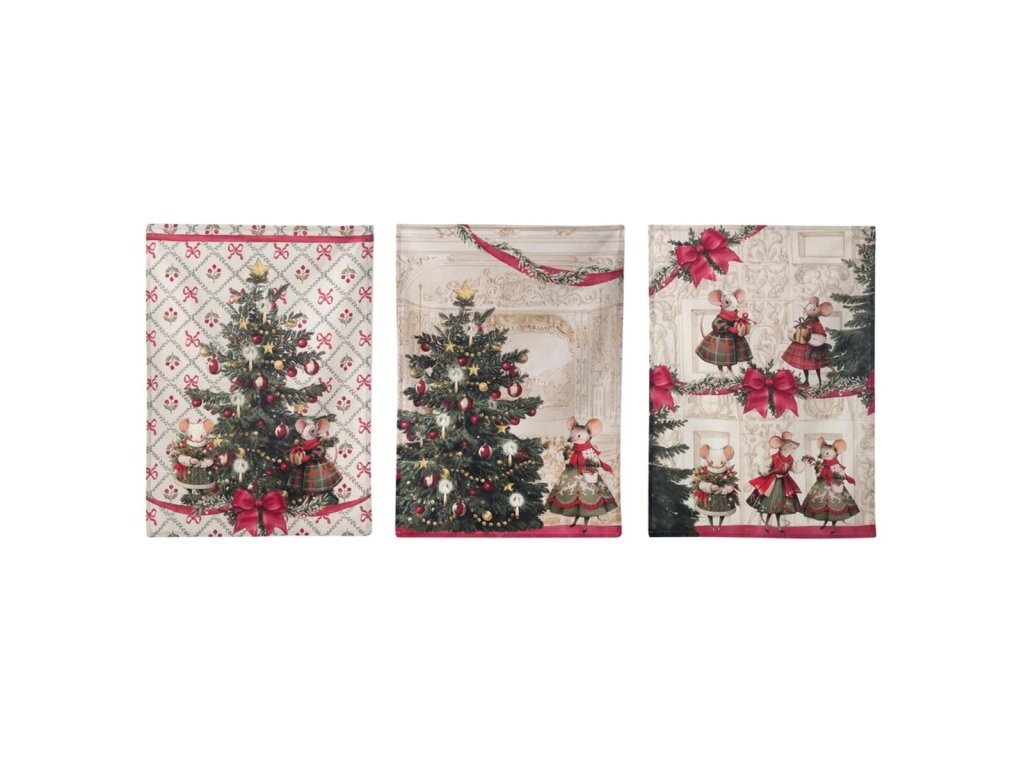 Elegantný vianočný set 3 bavlnených kuchynských utierok od talianskej značky Blanc Maricló z kolekcie Noel Famille je ideálnym doplnkom do sviatočnej kuchyne. Každá utierka má iný motív maľovaných vianočných myšiek v tradičných farbách – zelená, červená a biela. Set je zabalený v praktickej textilnej taštičke, vďaka čomu je vhodný aj ako darček. Vyrobené zo 100% bavlny – kvalitné, savé a príjemné na dotyk.
