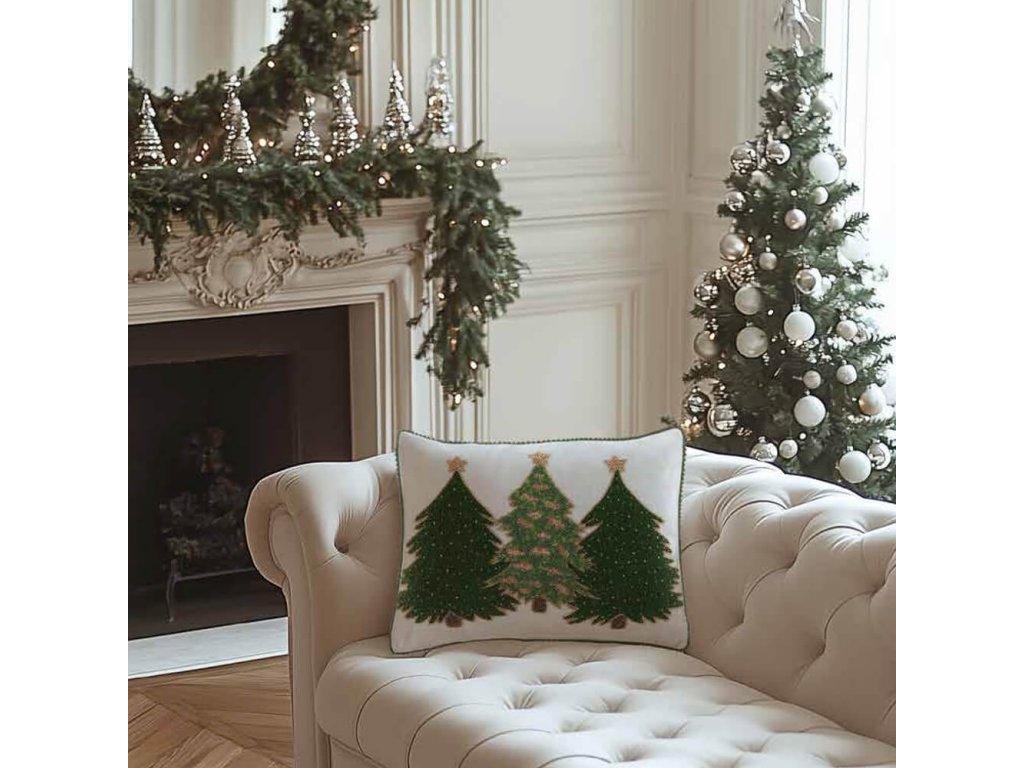 Vianočný vankúš Blanc Maricló – 35 × 50 cm, biely, výšivka so stromčekmi a oblemovanie