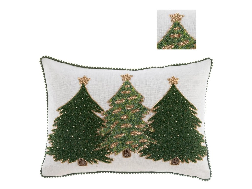Originálny vianočný vankúš od talianskej značky Blanc Maricló je štýlovým doplnkom na sviatočné dekorovanie. Vyrobený z 100% bavlny, s mäkkou polyesterovou výplňou, zdobený zlatou výšivkou stromčekov doplnenou o perličky a korálky. Biely podklad so zeleným oblemovaním dodáva tradičný vianočný vzhľad a elegantný charakter.