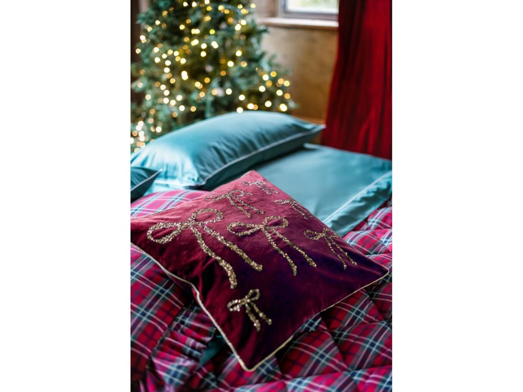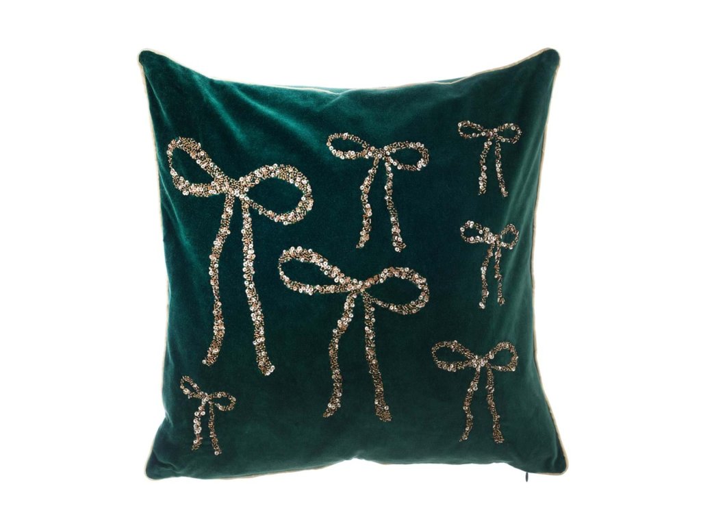Originálny vianočný vankúš od talianskej značky Blanc Maricló je štýlovým doplnkom na sviatočné dekorovanie. Vyrobený z 100% mikrofibry, s mäkkou polyesterovou výplňou, zdobený zlatou výšivkou mašličiek. Zelený zamatový podklad dodáva tradičný vianočný vzhľad a elegantný charakter.