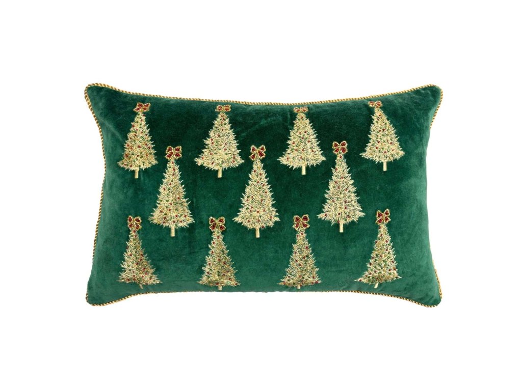 Rozmery: 30 × 50 cm Materiál: návliečka – 100% bavlna, výplň – polyester Farba: zelený podklad, zlatá výšivka Motív: vianočné stromčeky s perličkami