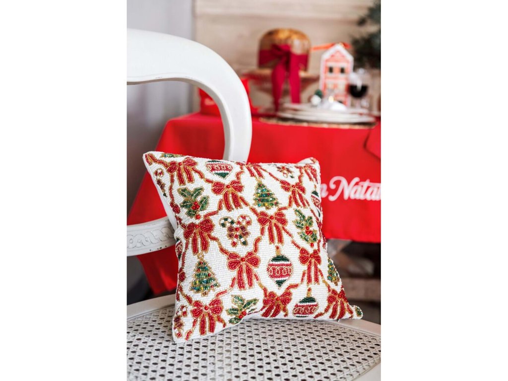 Luxusný vianočný vankúš s výplňou od talianskej značky Blanc Maricló je výnimočným doplnkom do interiéru. Vyrobený z kvalitnej 100% bavlny, výplň z polyesteru. Bohatá výšivka v červenej, zlatej a zelenej farbe je kompletne zdobená perličkami a korálkami, čo dodáva vankúšu slávnostný a elegantný vzhľad. Originálny výrobok z toskánskej dielne s dôrazom na detail a remeselnú kvalitu.