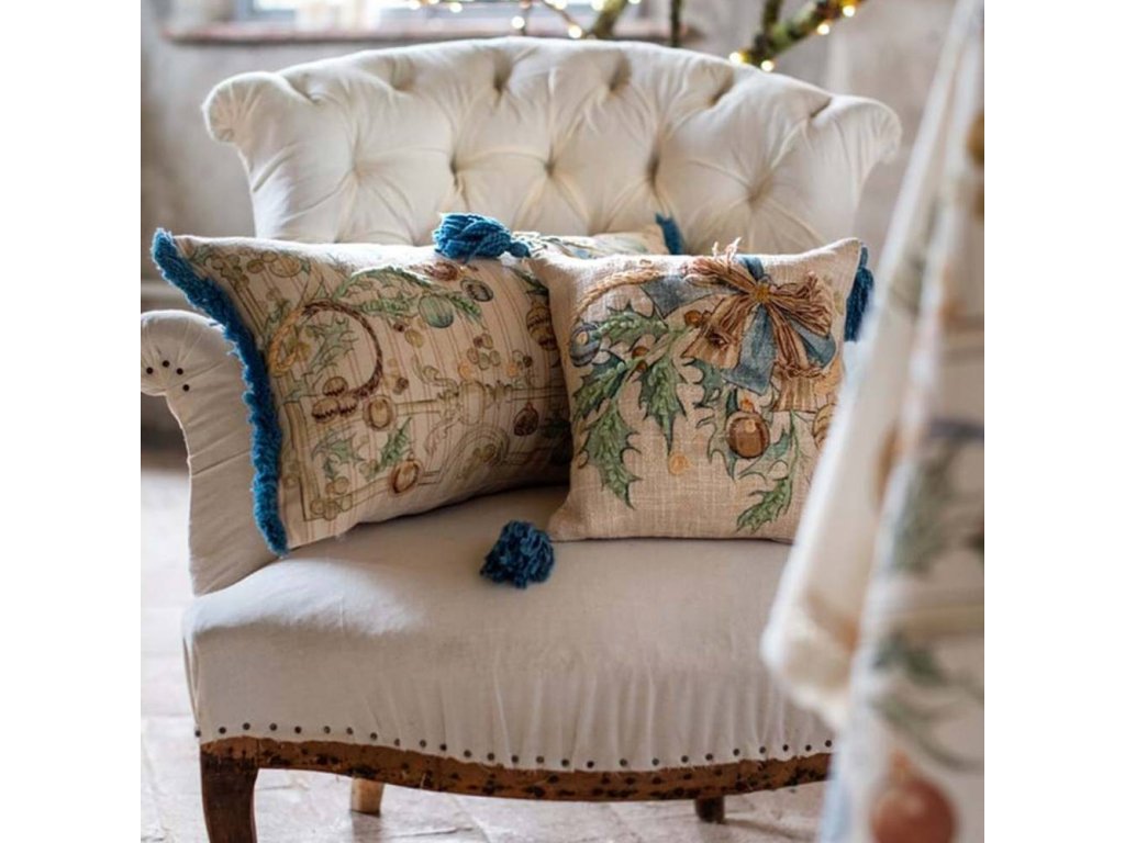 Romantický dekoratívny vankúš s potlačou a výšivkou od talianskej značky Blanc Maricló z kolekcie Intrecci di Sogno je štýlovým doplnkom do interiéru s vintage nádychom. Vyrobený zo 100% bavlny, zdobený jemnou výšivkou a potlačou v odtieňoch zelenohnedej a modrej na krémovom podklade, s motívmi ornamentov, ozdôb a mašličiek, pôsobí nežne, elegantne a útulne. Tento originálny výrobok z toskánskej dielne je navrhnutý s dôrazom na detail, kvalitu a romantickú estetiku.