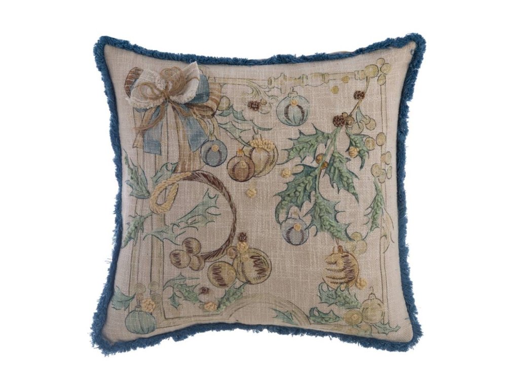 Romantický dekoratívny vankúš s potlačou a výšivkou od talianskej značky Blanc Maricló z kolekcie Intrecci di Sogno je štýlovým doplnkom do interiéru s vintage nádychom. Vyrobený zo 100% bavlny, zdobený jemnou výšivkou a potlačou v odtieňoch zelenohnedej a modrej na krémovom podklade, s motívmi ornamentov, ozdôb a mašličiek, pôsobí nežne, elegantne a útulne. Tento originálny výrobok z toskánskej dielne je navrhnutý s dôrazom na detail, kvalitu a romantickú estetiku.