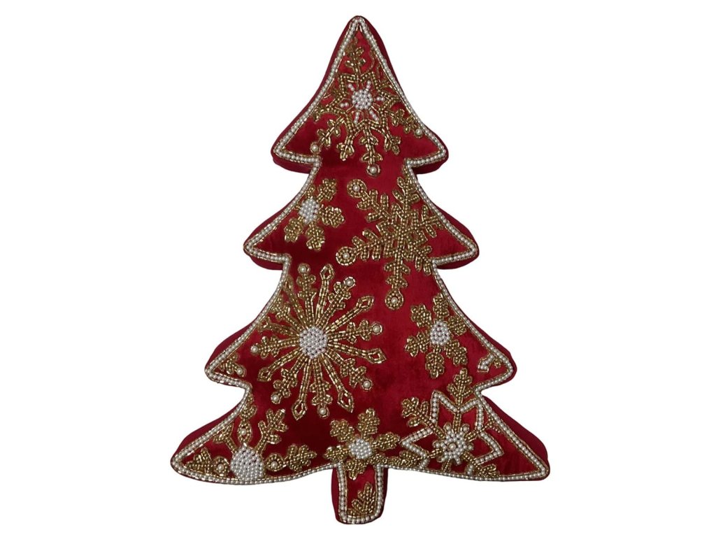 Originálny vianočný vankúš v tvare stromčeka od talianskej značky Blanc Maricló je štýlovým doplnkom na sviatočné dekorovanie. Vyrobený z kvalitnej textílie s podielom 55 % viskózy a 45 % bavlny, s mäkkou polyesterovou výplňou, zdobený zlatou výšivkou a aplikáciami snehových vločiek z perličiek a korálok. Červený podklad dodáva tradičný vianočný vzhľad a luxusný charakter.