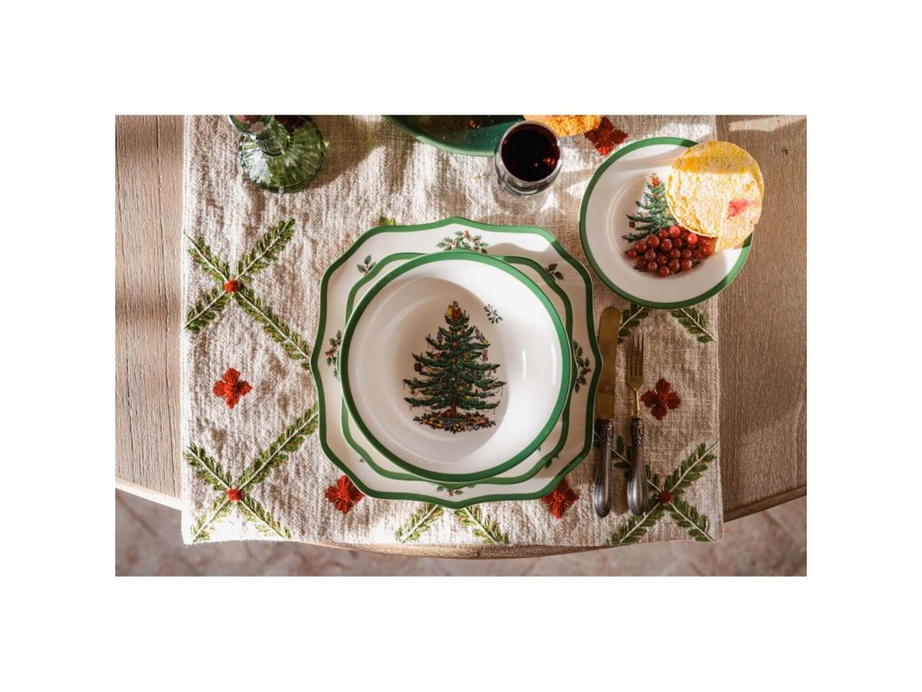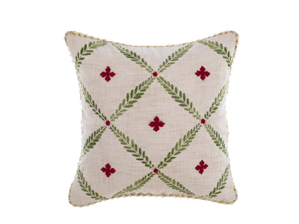 Elegantný vianočný bavlnený vankúš od značky Blanc Maricló z Toskánska. Vyrobený zo 100% bavlny. Béžový podklad zdobí výšivka so vzormi a lemovaním– ideálny na sviatočné doladenie interiéru.