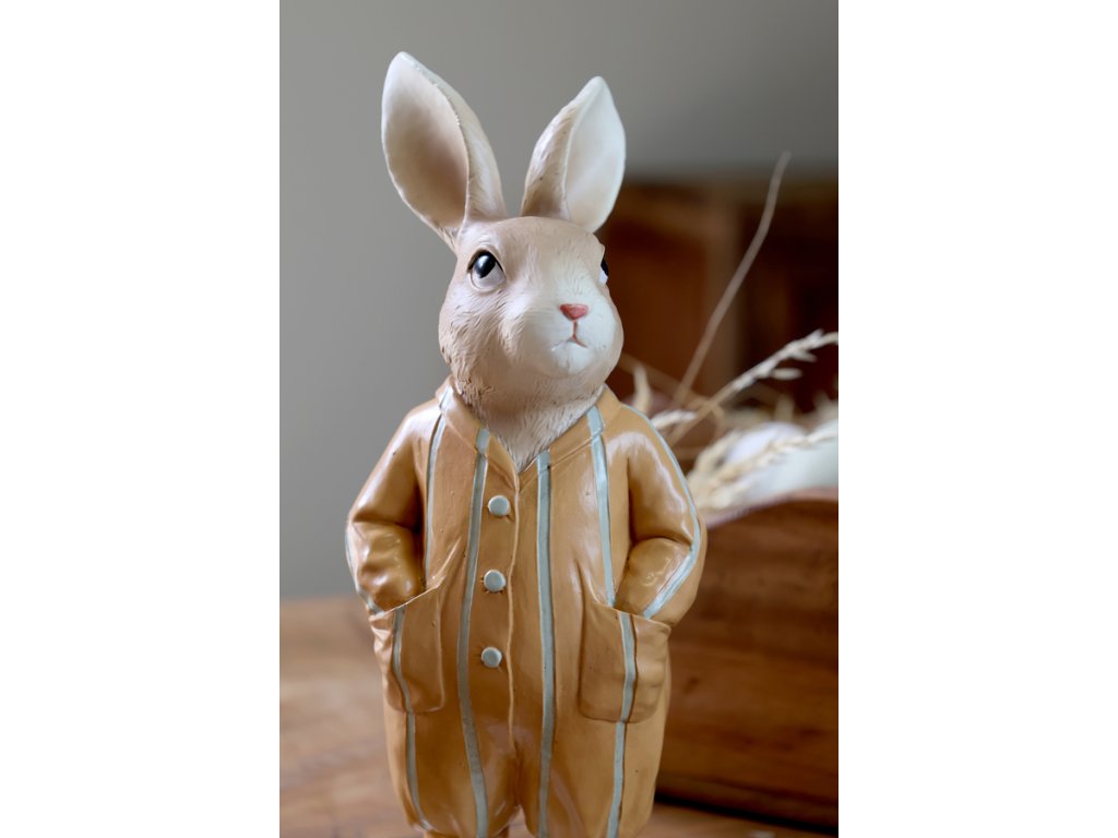 Dekoratívny zajačik v pyžame v jemných odtieňoch opálovej a lieskovej (hazel) farby pôsobí milo a elegantne zároveň. Ručne maľované detaily dodávajú figúrke osobitý charakter a zvýrazňujú jej romantický výraz. Vďaka neutrálnym farbám sa ľahko kombinuje s ďalšími jarnými či veľkonočnými dekoráciami, no krásne vynikne aj ako samostatný doplnok.