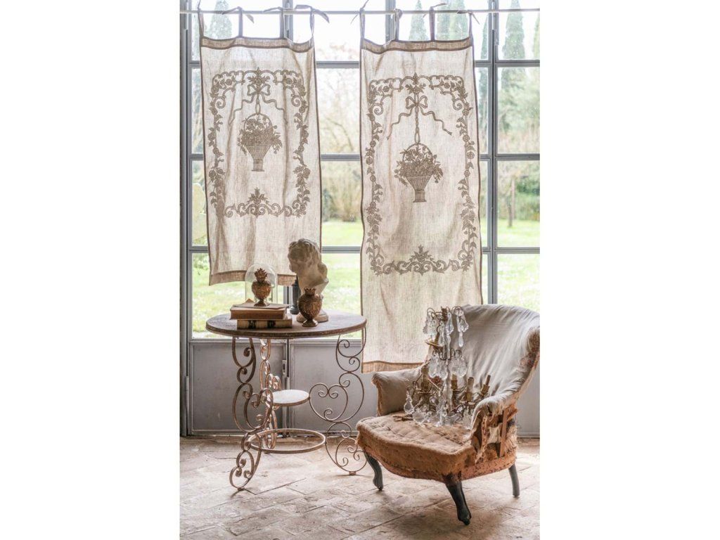 výška: 70 cm • šírka: 45 cm • materiál: 50 % ľan, 50 % bavlna • farba: hnedá / biela výšivka • vlastnosti: nepriehľadný, viazanie na mašličky • štýl: vintage / vidiecky / provensálsky • použitie: interiér – krátky záves / firánka • výrobca: Blanc Mariclò